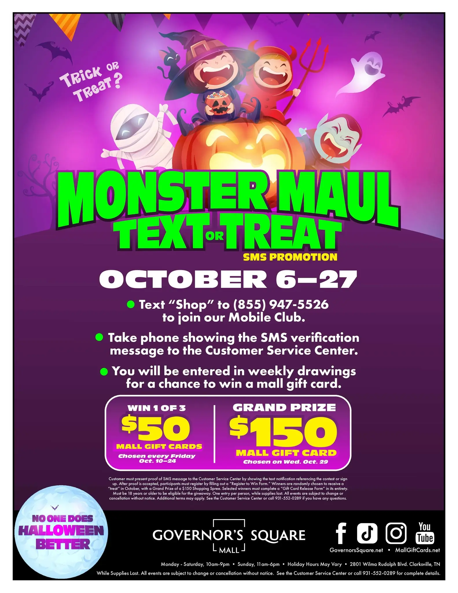 Join us this Halloween season for a fun and easy way to win mall gift cards. Just text “Shop” to (855) 947-5526 to sign up for our Mobile Club. Once you receive your confirmation message, bring it to the Customer Service Center to be entered into the giveaway.